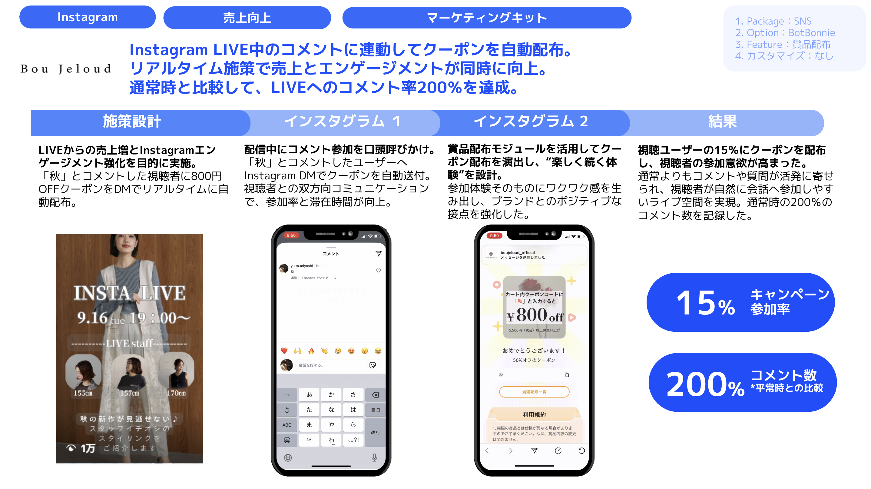 アパレルブランド「Bou Jeloud」「Bab」「CIEL'AIR」を展開する株式会社リンクイットでは、Instagram LIVEでの配信にあたりBotBonnieのInstagram自動返信機能や賞品配布機能を活用したことで、以前の同様のInstagram LIVE配信と比較してコメント率が2倍と大幅な改善をすることに成功しました。