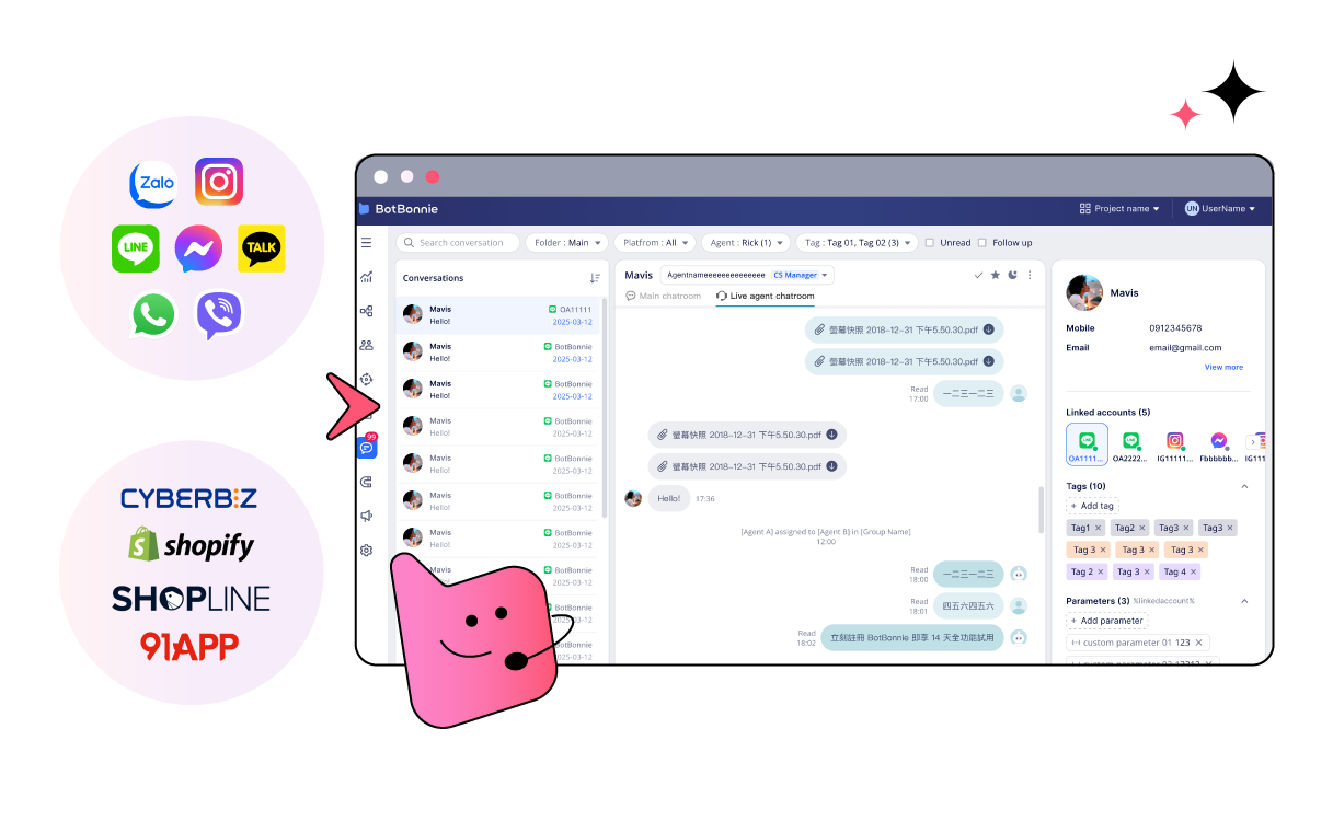 整合多個對話管道,集中管理所有顧客訊息,客服不必來回切換視窗,回覆不中斷。